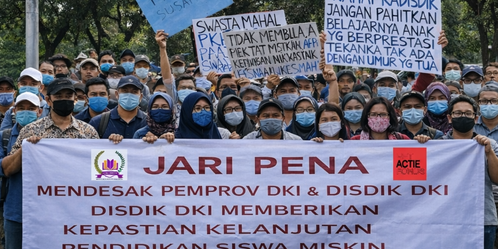 Met de steun van Het Actiefonds organiseerde JARI PENA in januari 2026 een protest om slachtoffers van oneerlijk onderwijsbeleid een platform te bieden en de provinciale overheid van Jakarta drie duidelijke eisen voor te leggen. De demonstranten eisten de afschaffing van alle schoolgelden die gezinnen met een laag inkomen belasten, de versnelling en uitbreiding van overheidstoeslagen voor onderwijs, evenals de verbetering van beroepsprocedures en het beperken van de toenemende commercialisering van privéscholen. De deelnemers droegen maskers als symbool voor de smoesjes van de overheid en hun onvermogen om te luisteren.
